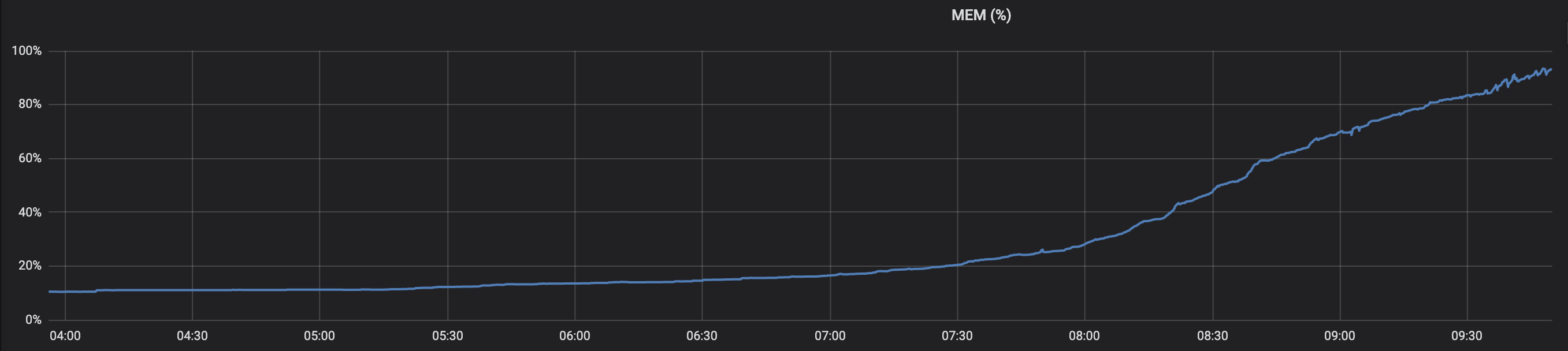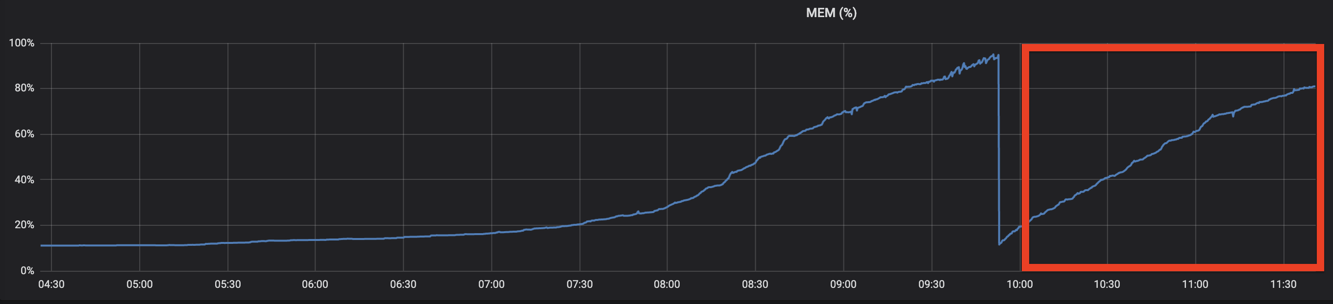 ๋๋ถ์ด, ํ ํ๋ก์ธ์ค์ ๋ฉ๋ชจ๋ฆฌ ์ฌ์ฉ๋์ด ์์ ๊ฐ์ด ์ฐ์ํฅ์ผ๋ก ์ฆ๊ฐํ๋ ๊ฒ๊ณผ ์ธ์ ๋๋ ํธ๋ํฝ์ด ๋ง์ ๋ ๋ฉ๋ชจ๋ฆฌ ์ฌ์ฉ๋์ด ๊ธ์ฆํ๋ ๊ฒ์ผ๋ก ๋ณด์ ๋ฉ๋ชจ๋ฆฌ ๋์(Memory Leak) ํ์์ผ๋ก ํ๋จํ์๋ค.