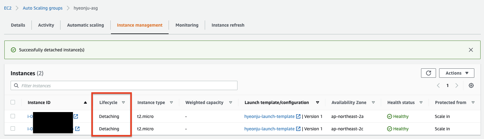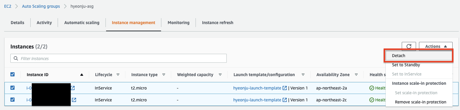 - Auto Scaling Group ์ฝ์ > Instance management ํญ > Actions ๋ฒํผ > [Detach] ์ ํ