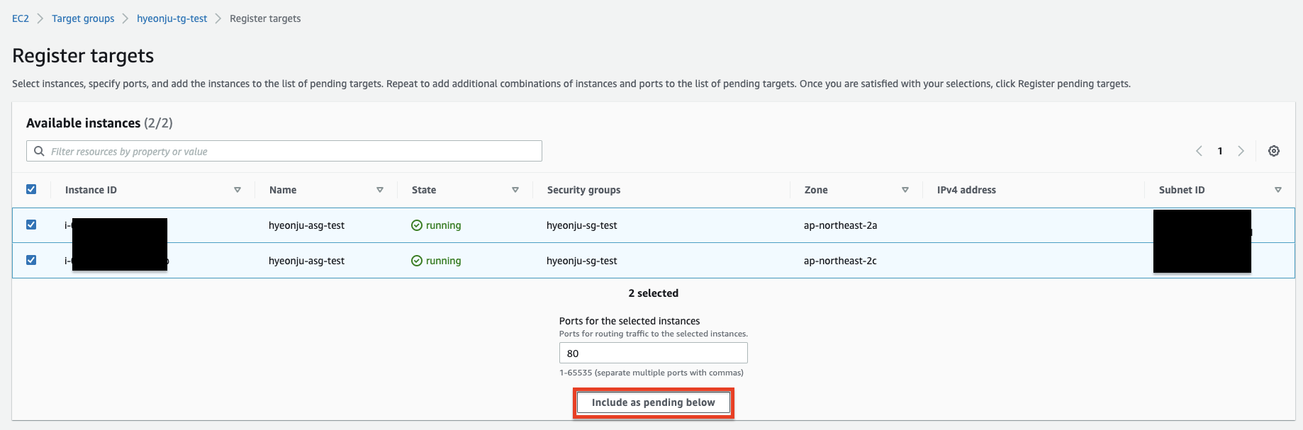 ๋ณธ ํฌ์คํ ์์๋ ASG ์ญ์ ๋ฅผ ์ํ์ง๋ง ์ฌ์ฉ์๊ฐ ์ฌ์ ํ ์๋น์ค๋ฅผ ์ด์ฉํ ์ ์๊ฒ ํ๋ ๊ฒ์ด ๋ชฉํ์ด๊ธฐ ๋๋ฌธ์ ์์ ๊ฐ์ด Target Group์ ๊ธฐ์กด EC2๋ฅผ ํ๊ฒ์ผ๋ก ๋ฑ๋กํ๋ค.
