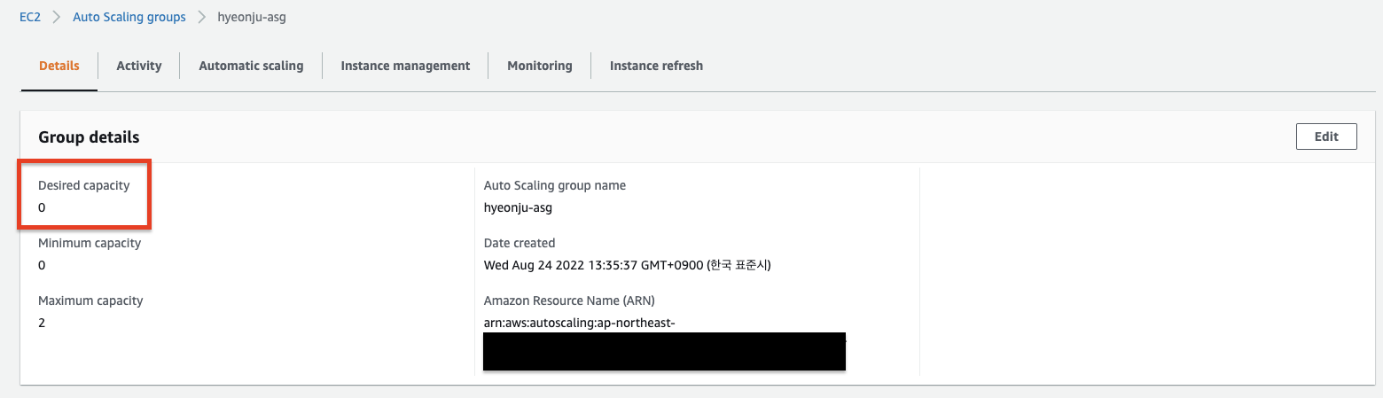 ASG ์ฝ์์์ ๋ชจ๋ Detach ์๋ฃ๋์ด Desired capacity๊ฐ 0์ด ๋์์ ํ์ธํ ์ ์๋ค.