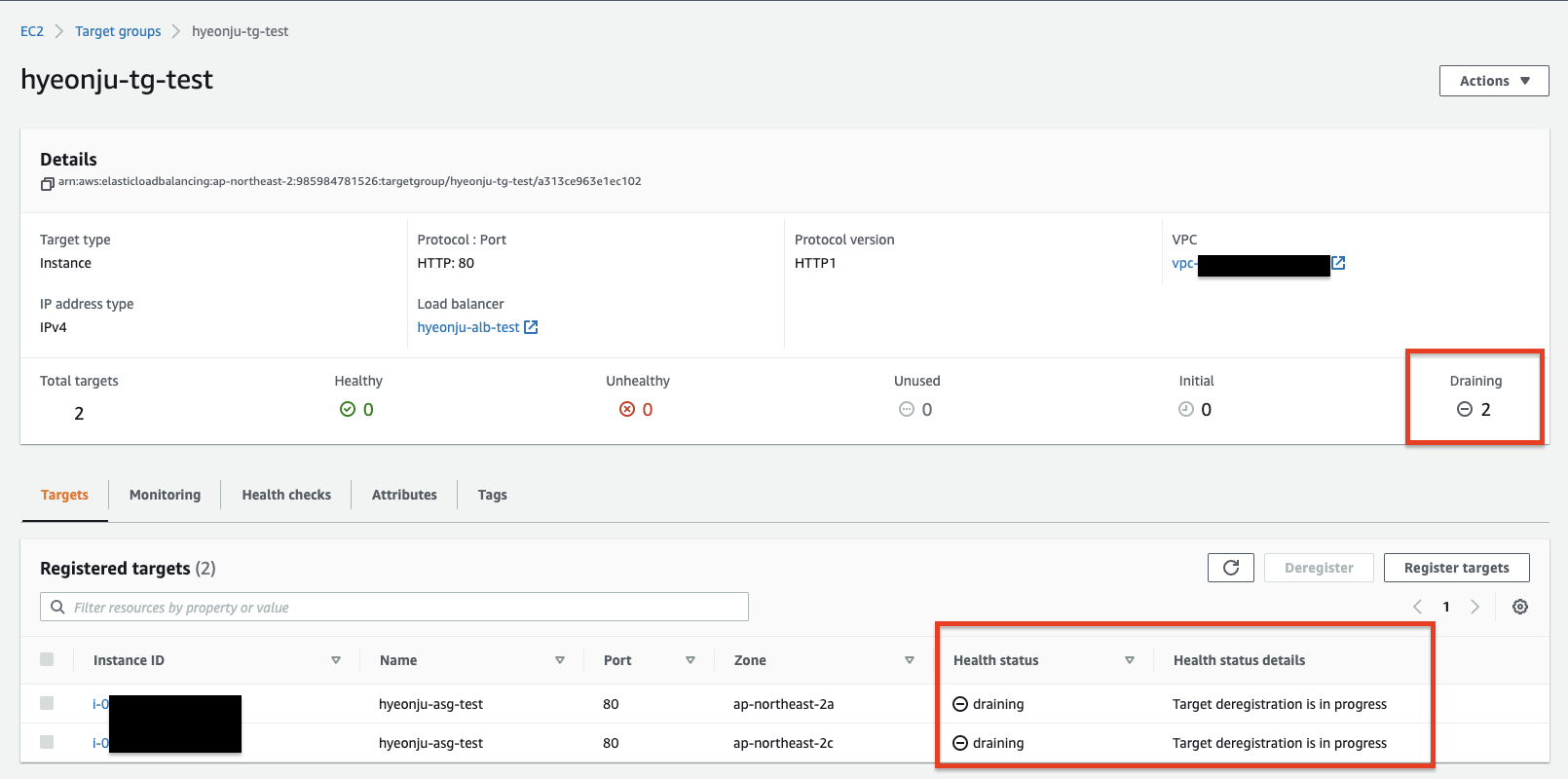 Auto Scaling Group์ด Load Balancer์ Target Group๊ณผ ์ฐ๊ฒฐ์ด ๋์ด ์๋ ๊ฒฝ์ฐ, ์์ ๊ฐ์ด Detach๋ฅผ ์๋ํ EC2 ์ธ์คํด์ค๊ฐ ์ฆ์ ELB Target Group์์ Draining ๋๋ค.