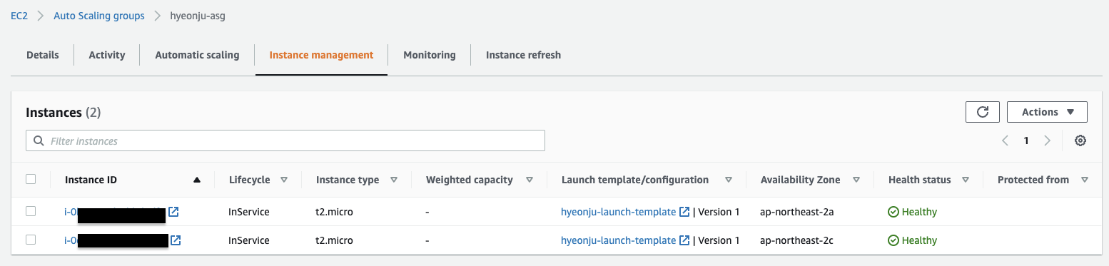 - Auto Scaling Group ์ฝ์ > Instance management ํญ > Actions ๋ฒํผ > [Set scale-in protection] ์ ํ