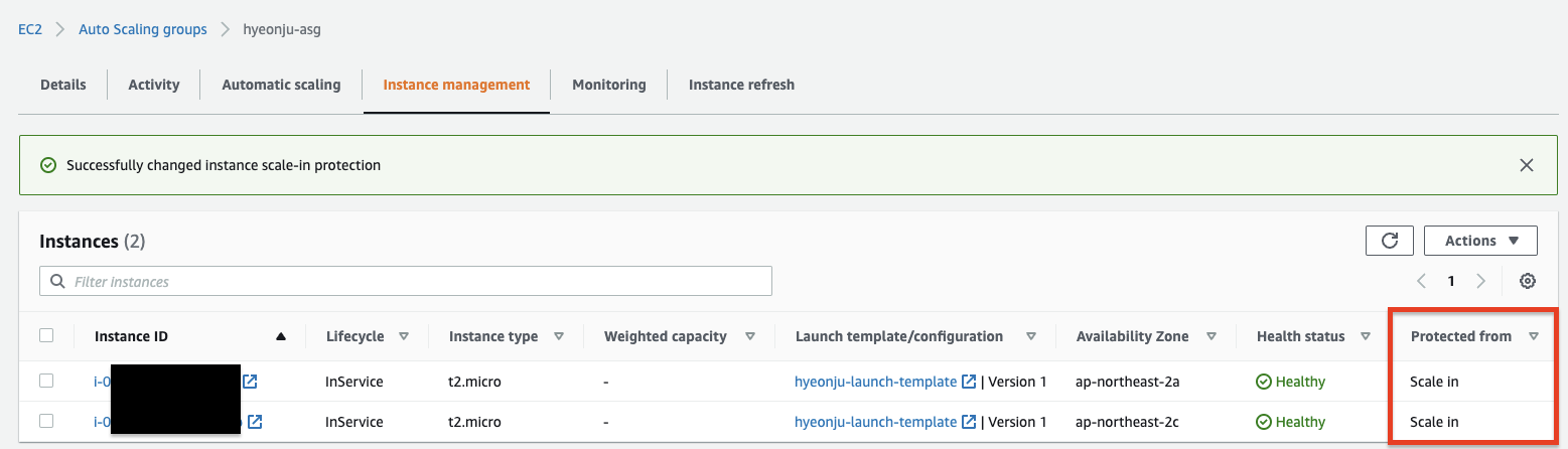 ์์ ๊ฐ์ด Instances์ [Protected from] ์ค์ ์ด Scale in์ผ๋ก ๋ณ๊ฒฝ๋๋ค.