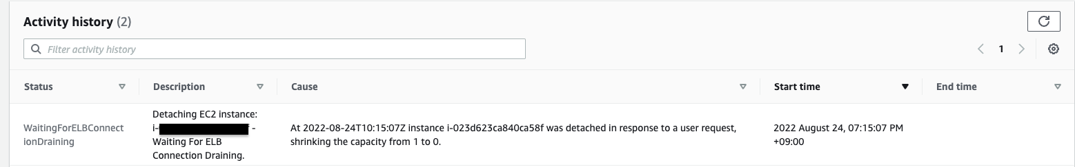์บก์ฒ๋ 1๋ฒ์์ 2๊ฐ์ ์ธ์คํด์ค์ ๋ํด ์ถ์ ๋ณดํธ ์ค์ ์ ํ์๋๋ฐ Desired Capacity๋ฅผ 0์ผ๋ก ๋ณ๊ฒฝํ ๊ฒฝ์ฐ์ด๋ค. Activity History์์ Auto Scaling Group์ ๋ชจ๋ activity๋ฅผ ํ์ธํ ์ ์๋ค.