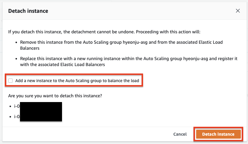 ์ฒดํฌ๋ฐ์ค์ ์ฒดํฌ๋ฅผ ํ๋ ๊ฒ์ ์๋ก์ด ์ธ์คํด์ค๋ฅผ ์์ฑํ์ฌ Auto Scaling Group์ ์ถ๊ฐ๋ฅผ ํ๋ ๊ฒ์ผ๋ก ํด๋น ์ํฉ์์์ detach์ ์๋ฏธ๊ฐ ์๋ค.