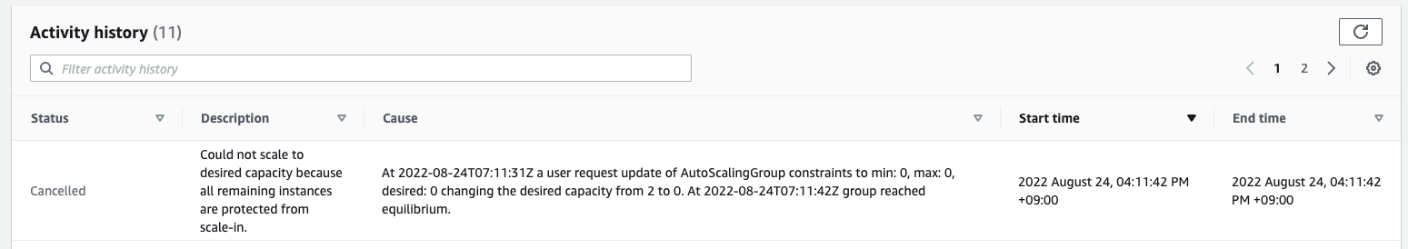 Desired capacity๋ฅผ ์ถ์ ๋ณดํธ ์ค์ ํ ์ธ์คํด์ค ์๋ณด๋ค ์ ์ ์๋ก ๋ณ๊ฒฝํ๋ ๊ฒฝ์ฐ, ์์ ๊ฐ์ด cancel ๋๋ฉฐ ์ ๋๋ก ๋ณ๊ฒฝ๋์ง ์๋๋ค.