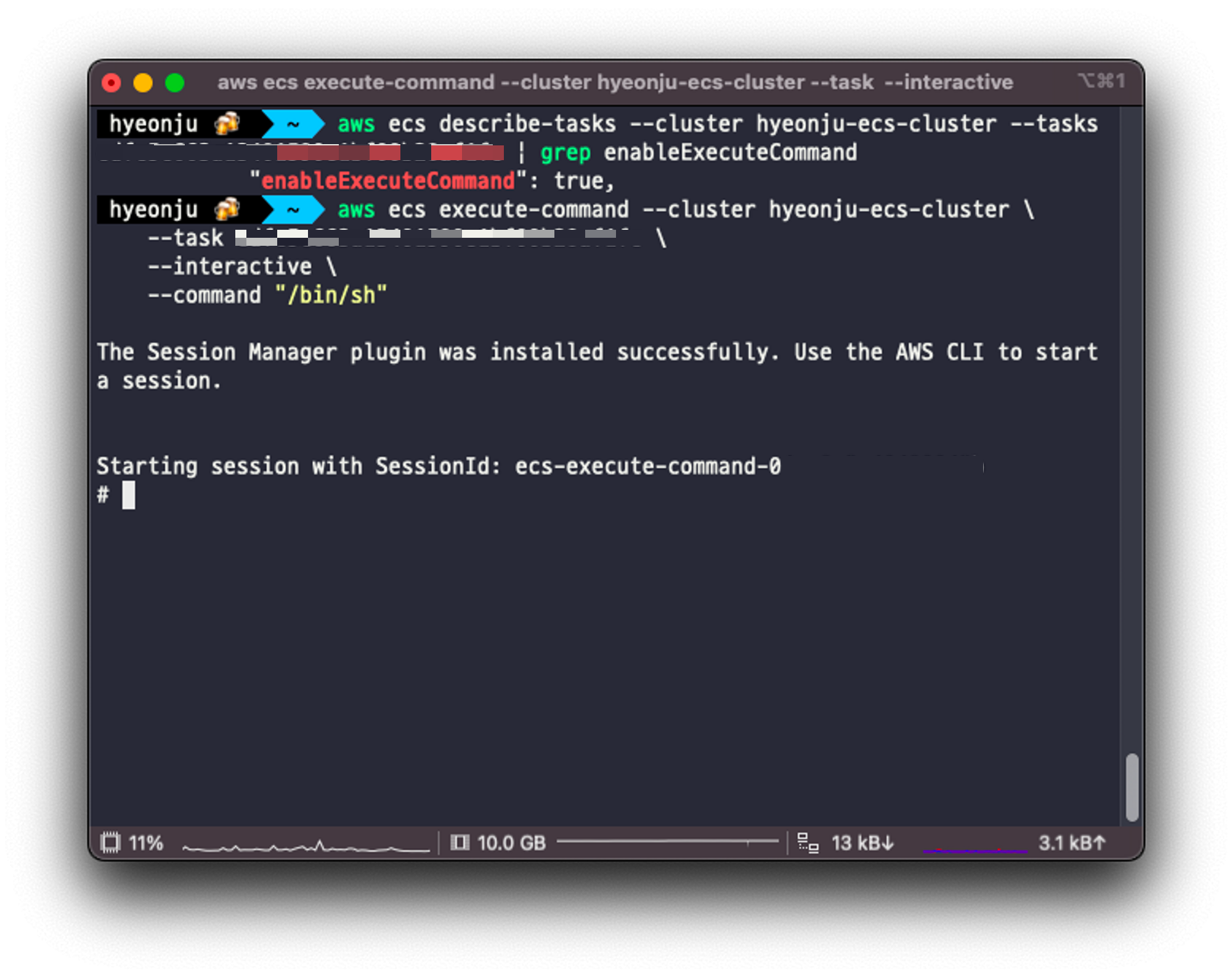 # aws ecs describe-tasks --cluster hyeonju-ecs-cluster --tasks { task-id } | grep enableExecuteCommand