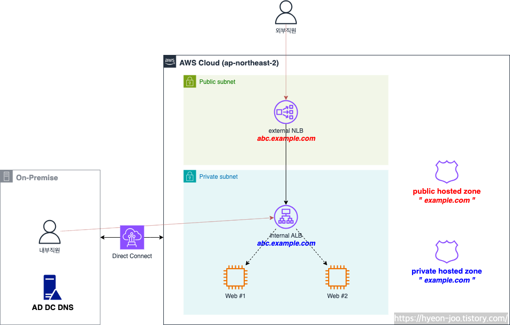 - public hosted zone์์ ๋ ์ฝ๋๊ฐ ๋ฑ๋ก๋์ด, ๋ด๋ถ ์ง์์ direct conenct๋ก ์ฐ๊ฒฐ๋์ด ์์์๋ ๋ถ๊ตฌํ๊ณ ์ธํฐ๋ท์ ํตํด ์ธ๋ถ๋ง์ ๋๊ฐ๋ค๊ฐ AWS๋ก ๋ค์ด์ด. ๋ถํ์ํ ๋คํธ์ํฌ ์ค๋ฒํค๋ ๋ฐ์.